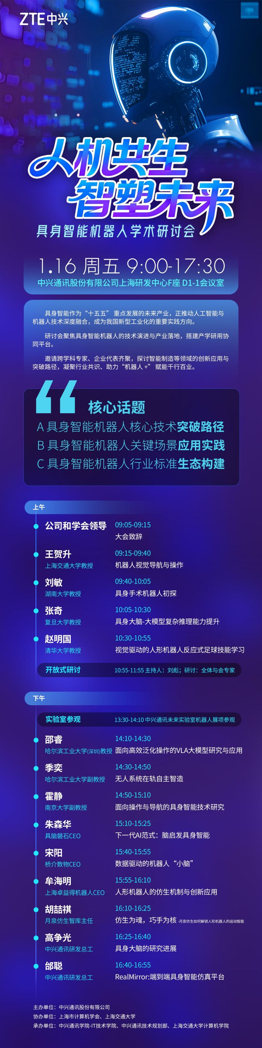 当人工智能的“大脑”开始寻求一具能够感知和行动的“身体”,一场关于未来的智能革命已悄然进入深水区。2026年1月16日上海,由中兴通讯股份有限公司主办,上海市计算机学会、上海交通大学计算机学院协办的“2026具身智能机器人学术研讨会”在中兴通讯上海研发中心落下帷幕。研讨会以“人机共生,智塑未来”为主题,汇聚了来自清华大学、上海交通大学、复旦大学、湖南大学、南京大学等顶尖高校,以及具脑磐石、桥介数物、卓益得机器人、月泉仿生等前沿科技企业的三十余位专家学者与产业代表,共同为机器人装上“类人”的感知与行动能力,探寻其从实验室走向千行百业的现实路径。