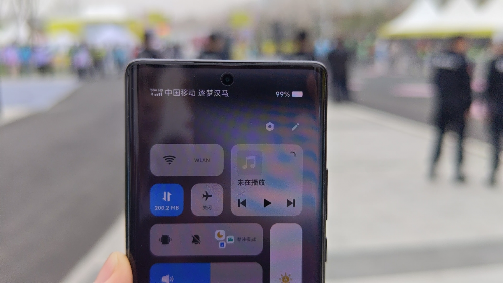 在半程马拉松终点、全程马拉松终点等核心区域,不少参赛跑者惊喜发现,手机左上角出现了“中国移动 逐梦汉马”的专属网络标识。这是武汉移动为用户特别定制的赛事网络服务,不仅增强了参赛者的身份认同感,更标志着一张智能化、场景化、专属化的5G-A精品网络已全面就位。