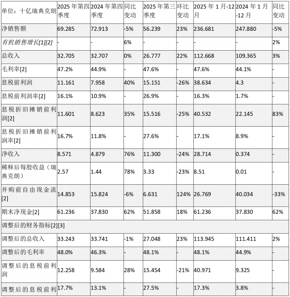 ·并购前自由现金流为268亿瑞典克朗(400亿瑞典克朗),现金流在净销售额中占比达到11.3%。