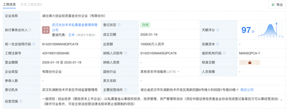 C114讯 1月26日消息(南山)据天眼查工商信息,1月19日,湖北烽火创业投资基金合伙企业(有限合伙)成立,股东方包括中国联通旗下联通战新私募股权投资基金(武汉)合伙企业(有限合伙)、湖北省投资引导基金有限公司、烽火通信等。