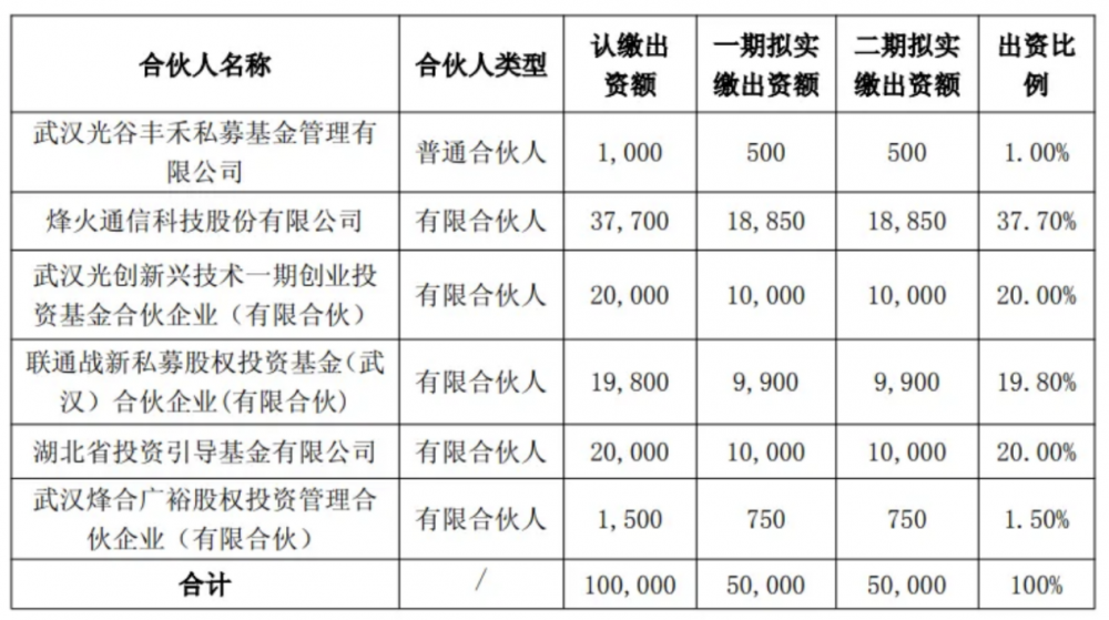 其中,烽火通信认缴出资3.77亿元,占出资总额的37.7%;联通战新基金认缴出资1.98亿元,占出资总额的19.8%。