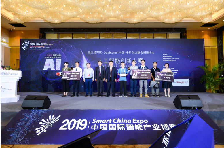 此外,会上对“AI赋能·智动未来”AI Kit人工智能创新大赛的前三名获奖项目进行了演示和颁奖。该大赛由重庆经济技术开发区、高通无线通信技术(中国)有限公司、中科创达软件股份有限公司联合主办,面向全国征集了涉及智慧视觉、智能汽车、智慧城市、智慧医疗等多个领域的50多个AI创意项目。