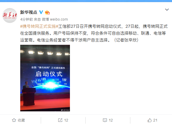 工信部27日召开携号转网启动仪式,27日起,携号转网正式在全国提供服务。用户号码保持不变,符合条件可自由选择移动、联通、电信等运营商。电信业务经营者不得干涉用户自主选择。