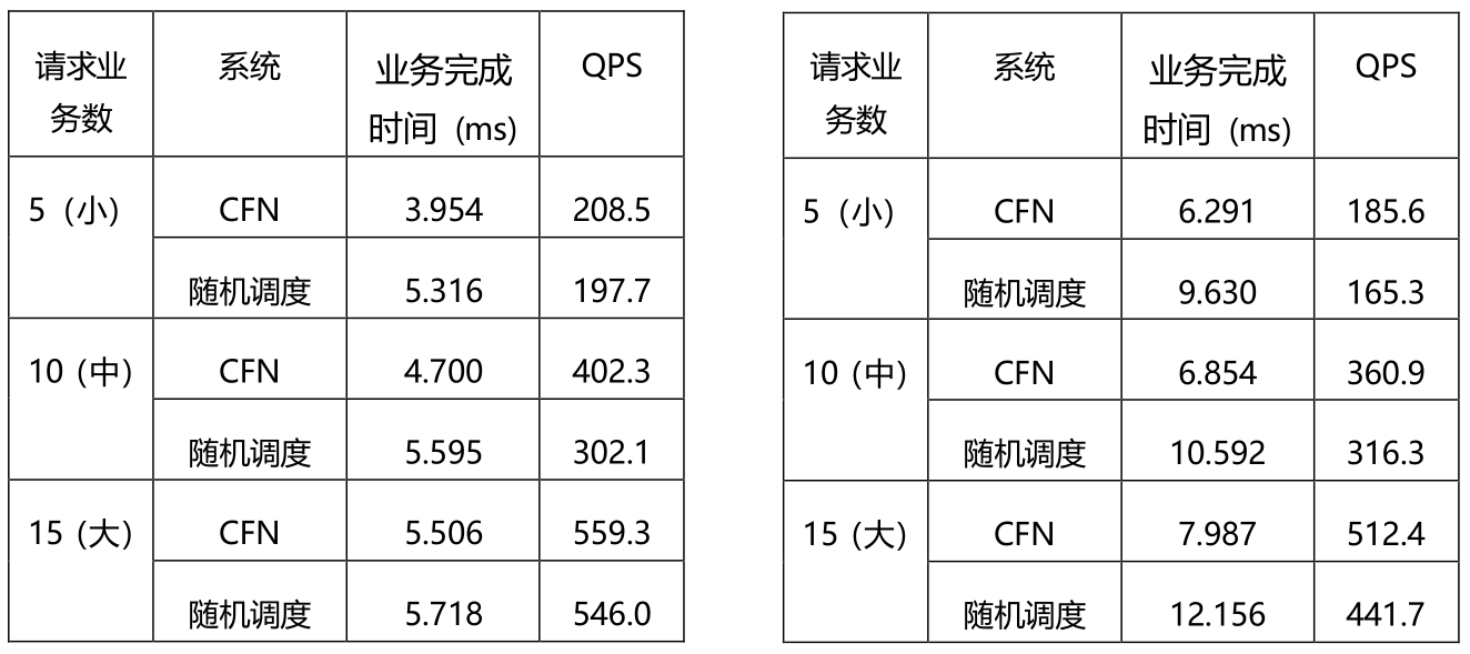 集成测试验证了CFN组件与现有MEC软硬件环境及业务系统的集成能力,实现端到端控制面与数据面的流程跑通。功能测试验证CFN新增的网络能力,包括根据网络以及服务状态优选计算位置的能力,业务流粘性保持能力,主动触发服务质量劣化业务流重连的能力。性能测试验证了使能算力感知网络后的MEC整体系统与基准MEC系统在数据面性能指标对比情况,测试表明使能算力感知网络后的系统单位时间完成的总任务数(Query Per Second, QPS),客户端感知的任务端到端完成时延,都得到有效提升。当系统算力容量和性能都比较均衡时,CFN比基准系统随机调度的QPS分别提升5.5%, 33.17%,业务完成时间分别降低25.62%,16.00%。当系统算力容量、性能不均衡时CFN比基准系统随机调度的QPS分别提升12.28%, 14.10%,16.01%,业务完成时间分别降低34.67%, 35.29%,34.30%,验证了通过使能算力感知网络后的系统实现系统资源利用率最优、用户体验最优。