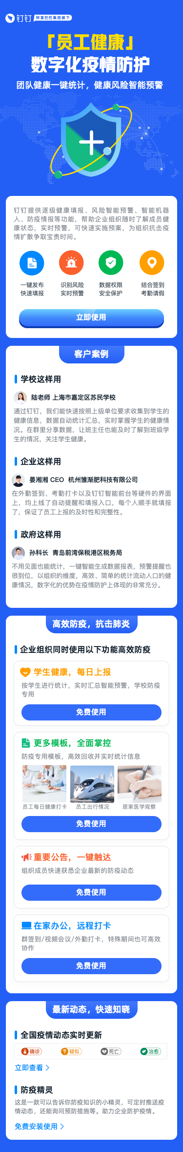 钉钉员工智能健康管理产品支持企业实时、智能化管理员工在疫情期间的健康状态,通过全新的疫情模板、置顶公告、疫情日志、签到时提醒等形式,保障重要疫情信息在组织内科学管控。该产品能够支持员工每日报平安,可快速收集、实时统计每个人的健康信息;支持异常信息预警并保护员工隐私;提供疫情推送与防护机器人等。钉钉免费向1000万企业组织提供此产品。