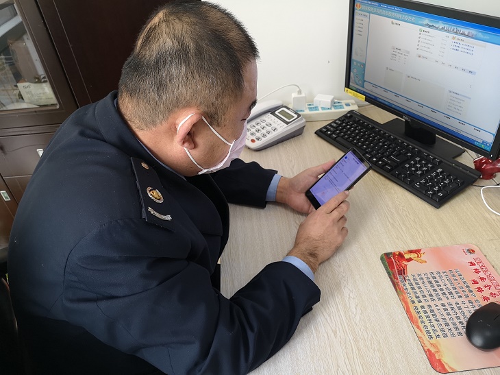(青岛前湾保税港区税务局纳税服务科科长孙勇,在手机上查看干部职工健康状况)