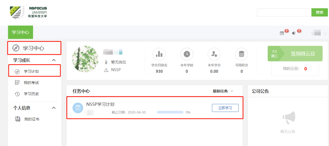 首先,联系各办事处渠道经理,获取学习账号。其次,登录绿盟科技大学:https://nsfocus.yunxuetang.cn/login.htm,通过【学习中心】--【学习计划】筛选学习课件。