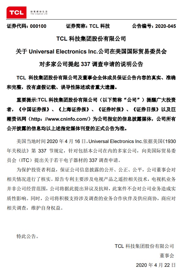 今日,TCL科技集团股份有限公司(以下简称为“TCL科技”)发布公告称,美国当地时间2020年4月16日,Universa lElectronicsInc.公司对包括TCL科技在内的多家公司,在美国国际贸易委员会提出关于若干电子器材的337调查申请。