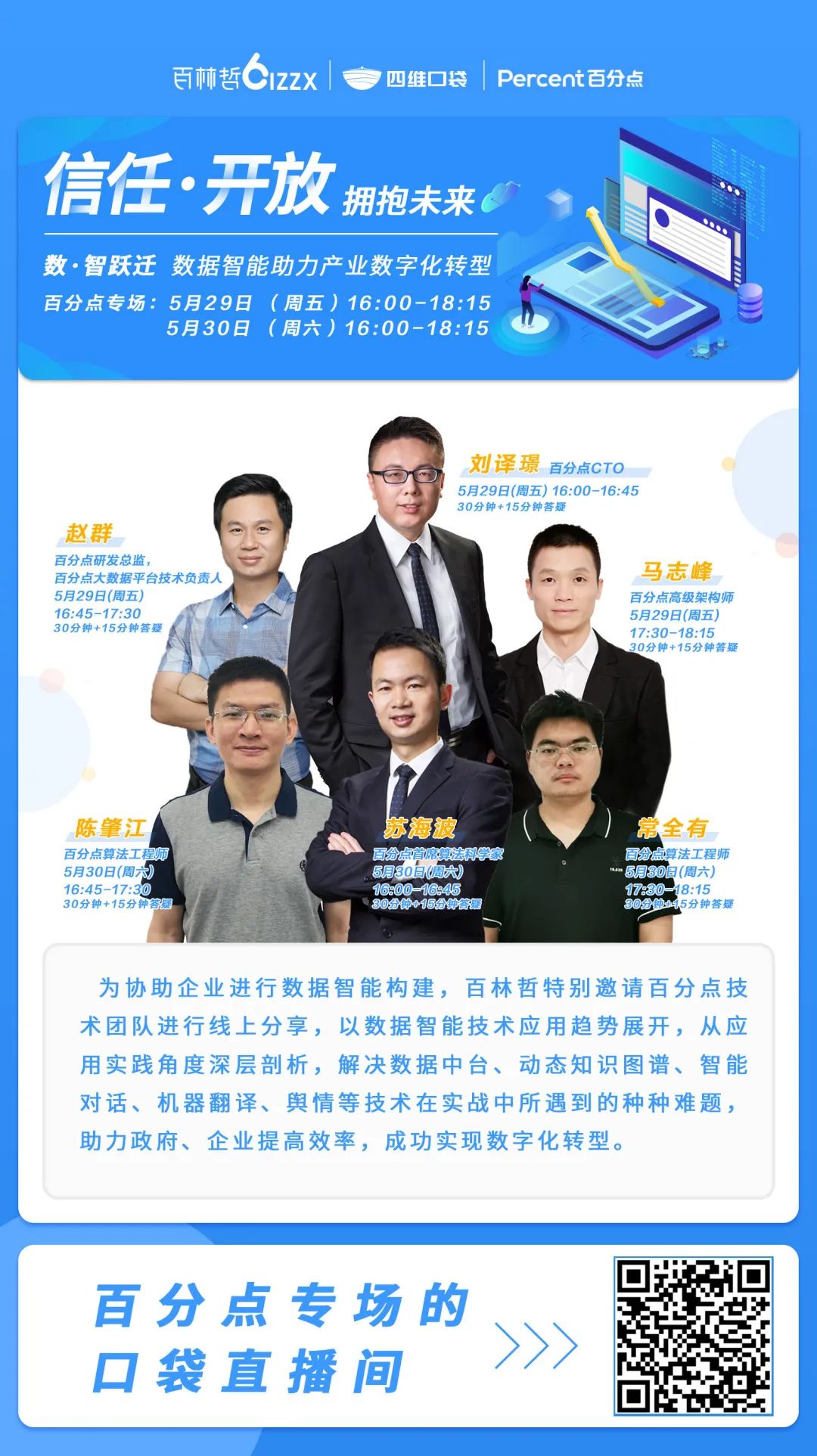 为协助企业进行数据智能构建,百林哲特别邀请百分点技术团队进行线上分享,以数据智能技术应用趋势展开,从应用实践角度深层剖析,解决数据中台、动态知识图谱、智能对话、机器翻译、舆情等技术在实战中所遇到的种种难题,助力政府、企业提高效率,成功实现数字化转型。