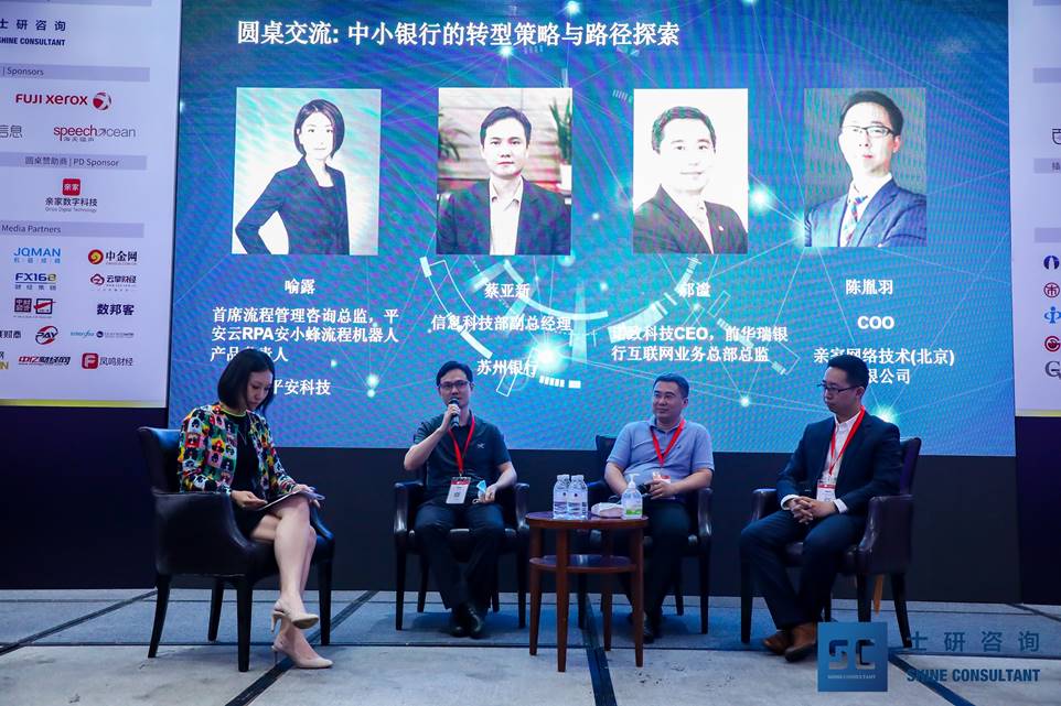 大会第一天下午17:00由平安科技首席流程管理咨询总监,平安云RPA 安小蜂流程机器人产品负责人 喻露主持,另与苏州银行信息科技部副总经理 蔡亚新,亿联银行助理CIO 兼科技运维部总经理 李树峰,亲家网络技术(北京)有限公司COO 陈胤羽就“中小银行的转型策略与路径探索” 展开了深入交流。