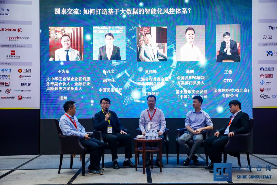 大会第二天上午由IBM 大中华区全球企业咨询服务部副合伙人、金融行业风险解决方案负责人 王为东主持,民生银行研究院院长 黄剑辉,工商银行上海分行普惠金融事业部副总经理 夏伟锋,富士施乐实业发展(中国)有限公司业务及RPA 解决方案部门负责人 薛鹏,亲家网络技术(北京)有限公司CTO 王敏先生就”如何打造基于大数据的智能化风控体系?“展开了精彩的讨论。