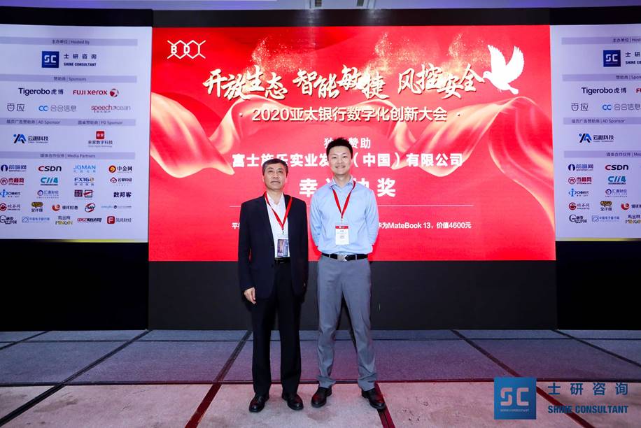 在上午10:15茶歇交流之前,由”富士施乐实业发展(中国)有限公司“ 独家赞助”抽奖互动环节开始,现场一片激动,同时恭喜第一天的获奖人“交通银行 周某”喜得价值4600元的华为Mate Book 13电脑大奖。