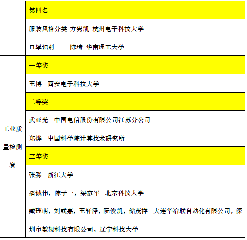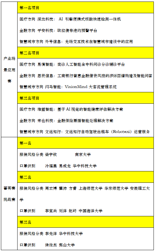 在本次AIWIN盛典的现场,三大分赛事的最终奖项也得以揭晓。上海市经济和信息化委员会人工智能处处长石伯明、中国工商银行软件开发中心总经理助理刘承岩、上海市人工智能行业协会秘书长陈海林为大赛产业场景应用赛揭晓了TOP3项目,英特尔(中国)有限公司物联网事业部开发者赋能部门中国区总监竺钧为菁英挑战赛揭晓了前四名的青年开发者团队,以及中国移动(上海)产业研究院工业人工智能产品总监祝晓旦为工业质量检测赛揭晓了一、二、三等奖的团队,获奖名单如下: