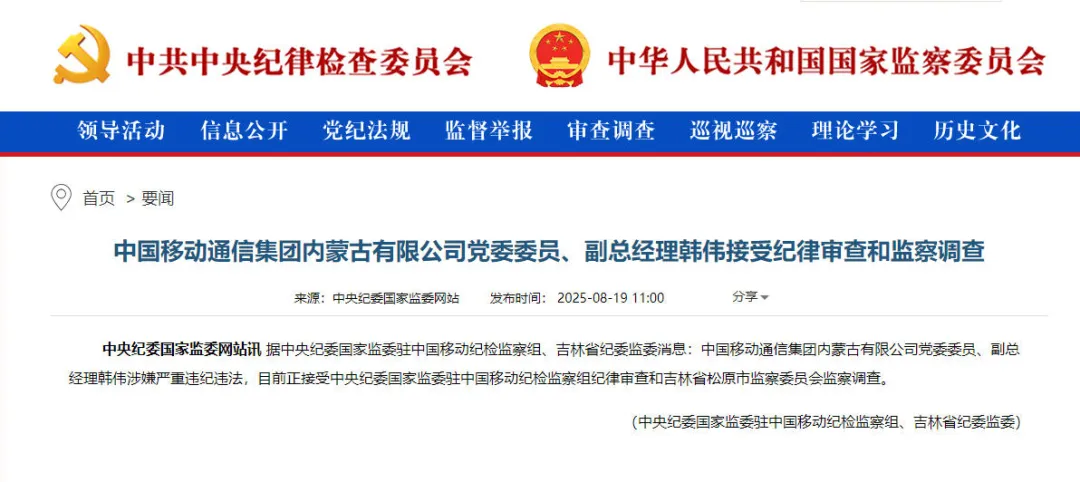 中央纪委国家监委网站8月19日11点发布消息:中国移动通信集团内蒙古有限公司党委委员、副总经理韩伟涉嫌严重违纪违法,目前正接受中央纪委国家监委驻中国移动纪检监察组纪律审查和吉林省松原市监察委员会监察调查。