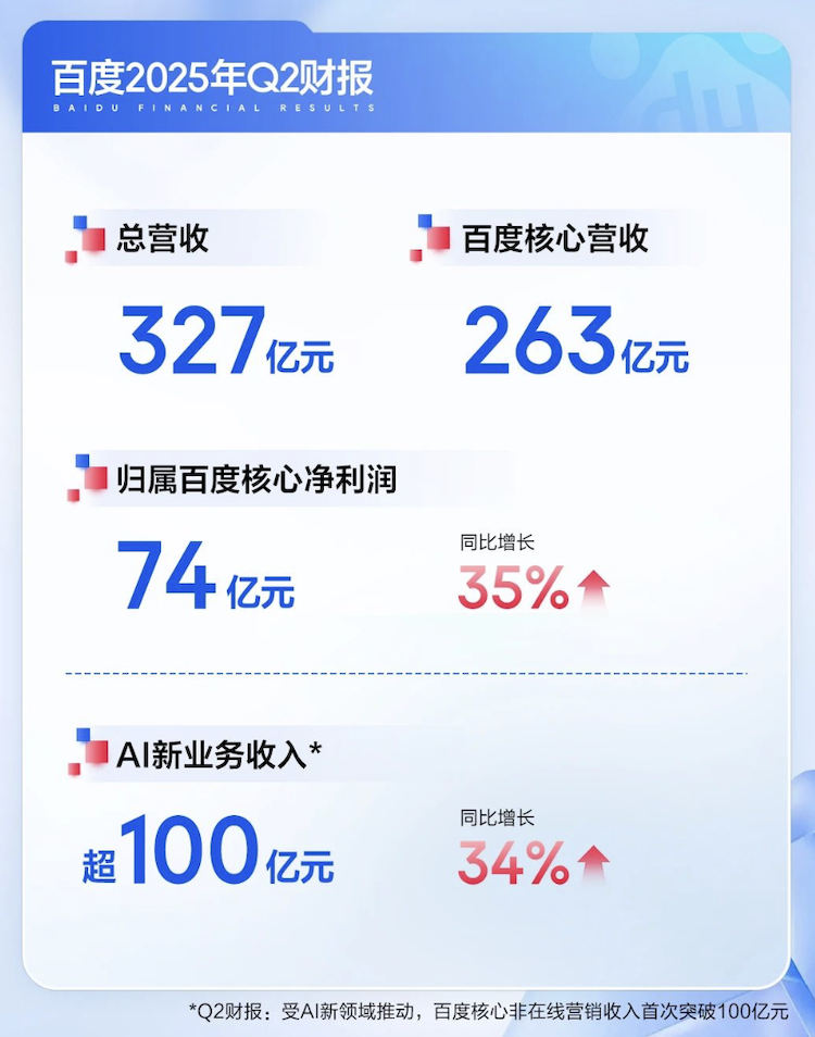 C114讯 8月20日消息(南山)今日,百度发布了2025年第二季度财报。财报显示,本季度实现营收327亿元,其中核心营收263亿元;归属百度核心净利润74亿元,同比增长35%。