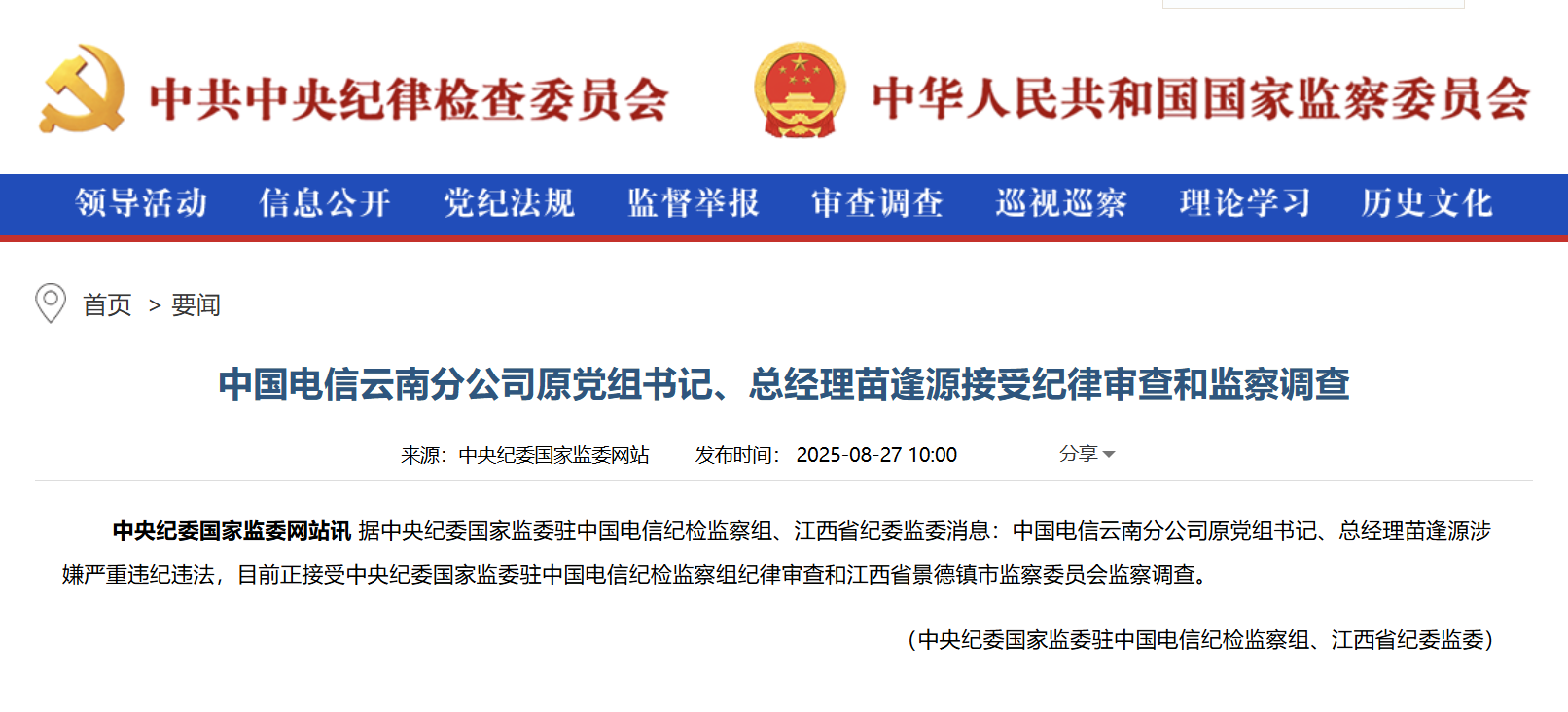 据中央纪委国家监委驻中国电信纪检监察组、江西省纪委监委消息:中国电信云南分公司原党组书记、总经理苗逢源涉嫌严重违纪违法,目前正接受中央纪委国家监委驻中国电信纪检监察组纪律审查和江西省景德镇市监察委员会监察调查。