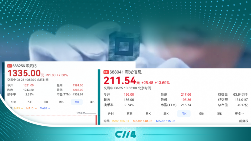 两大信创龙头寒武纪、海光信息的市值在股民追捧下,一路狂奔。