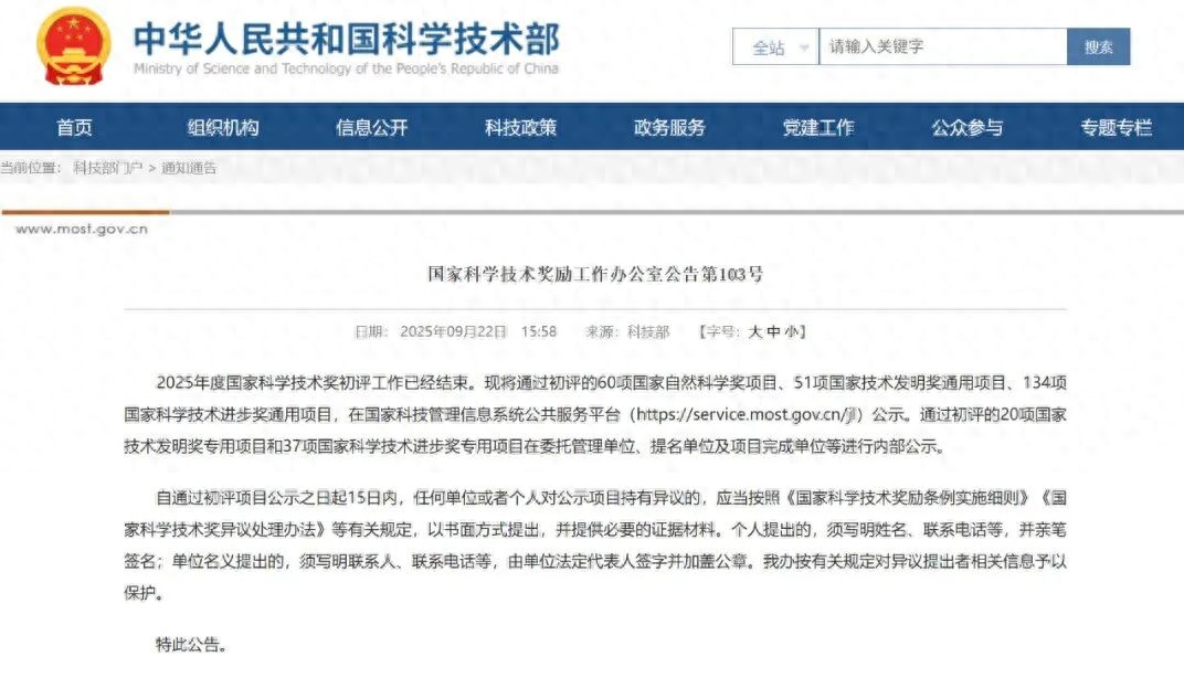 公告称,2025年度国家科学技术奖初评工作已经结束。现将通过初评的60项国家自然科学奖项目、51项国家技术发明奖通用项目、134项国家科学技术进步奖通用项目,在国家科技管理信息系统公共服务平台(https://service.most.gov.cn/jl)公示。通过初评的20项国家技术发明奖专用项目和37项国家科学技术进步奖专用项目在委托管理单位、提名单位及项目完成单位等进行内部公示。