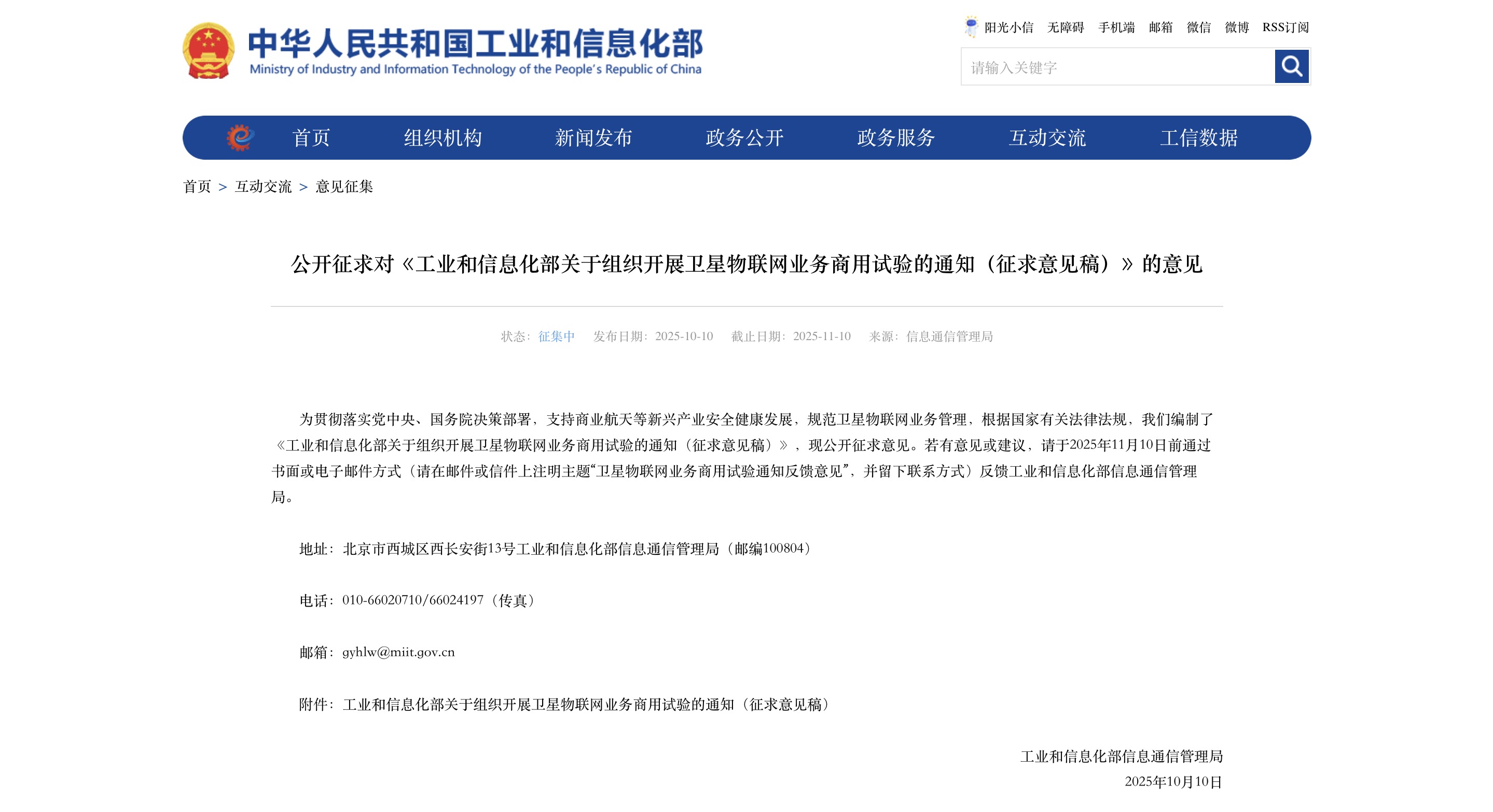 C114讯 10月11日消息(苡臻)昨日,工业和信息化部办公厅发布《工业和信息化部关于组织开展卫星物联网业务商用试验的通知(征求意见稿)》(以下简称《征求意见稿》),公开征求意见。