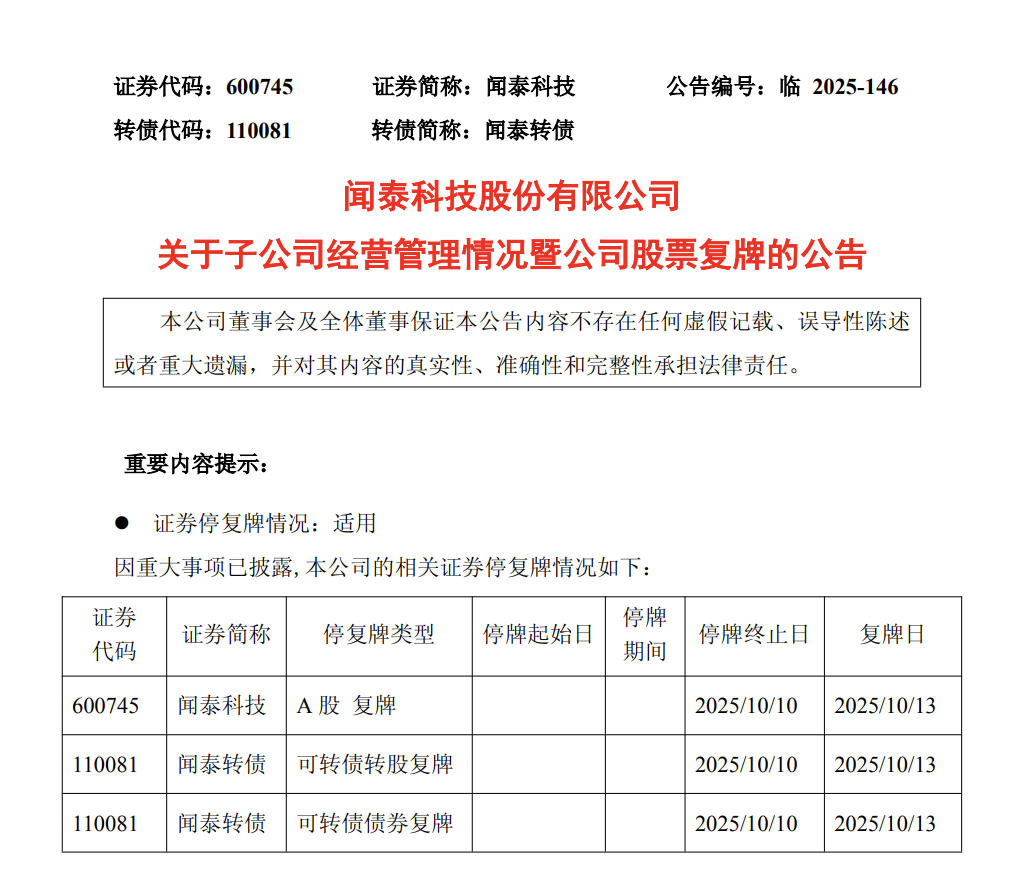 C114讯 10月13日消息(颜翊)10月12日,闻泰科技在上交所发布公告,披露其境外子公司安世半导体遭遇重大经营管控事件,并宣布公司股票及可转债自当日起复牌。