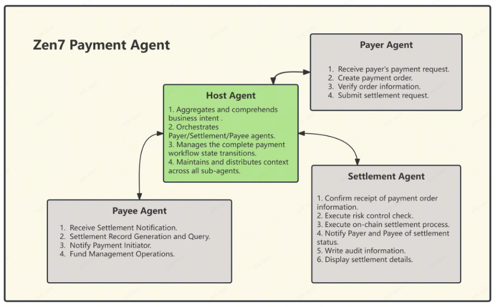 这一切的背后,正是 Zen7 Payment Agent 所构建的 多 Agent 协同支付架构——由 Payer Agent(付款方)、Payee Agent(收款方)、Settlement Agent(结算方)、Host Agent(协调方) 四类角色组成,自动完成从支付意图到资金结算的全过程。
