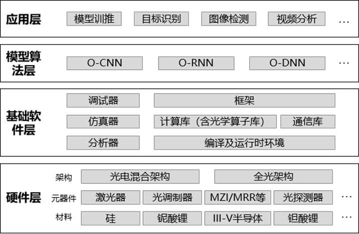 光计算技术架构包括硬件层、基础软件层、模型算法层和应用层,整体架构和内容仍在持续完善过程中。