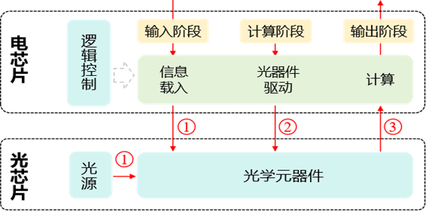 在光电混合架构中,计算任务被拆分为线性与非线性两部分,分别由光芯片与电芯片协同完成。其计算流程具体如下: