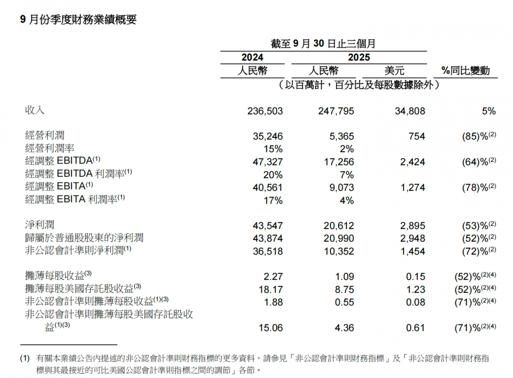 C114讯 11月26日消息(九九)阿里巴巴集团昨日发布2026财年第二季度(对应报告期为2025年第三季度)财报。