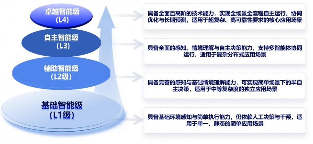 提出基础智能(L1)、辅助智能(L2)、自主智能(L3)、卓越智能(L4)四级分类体系,以科学反映智能体在不同场景下的成熟度与效能水平。