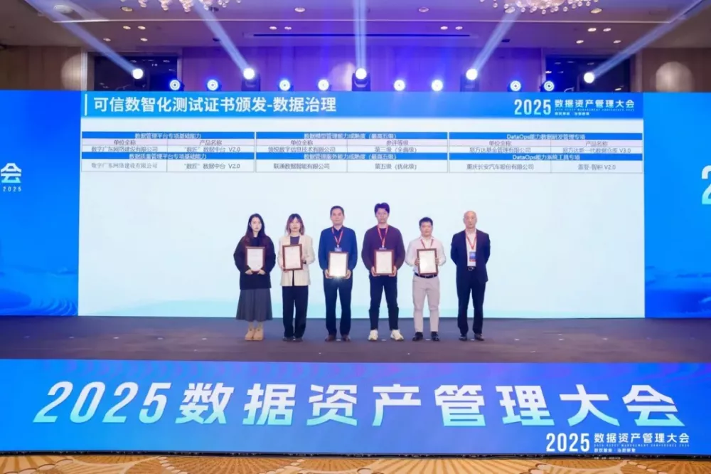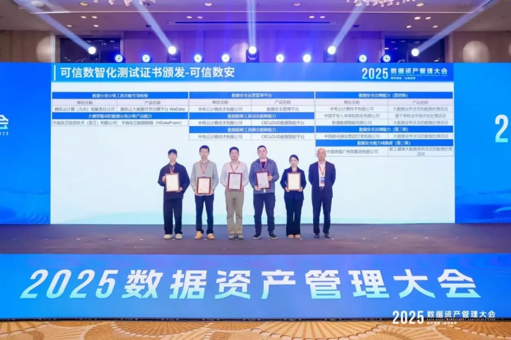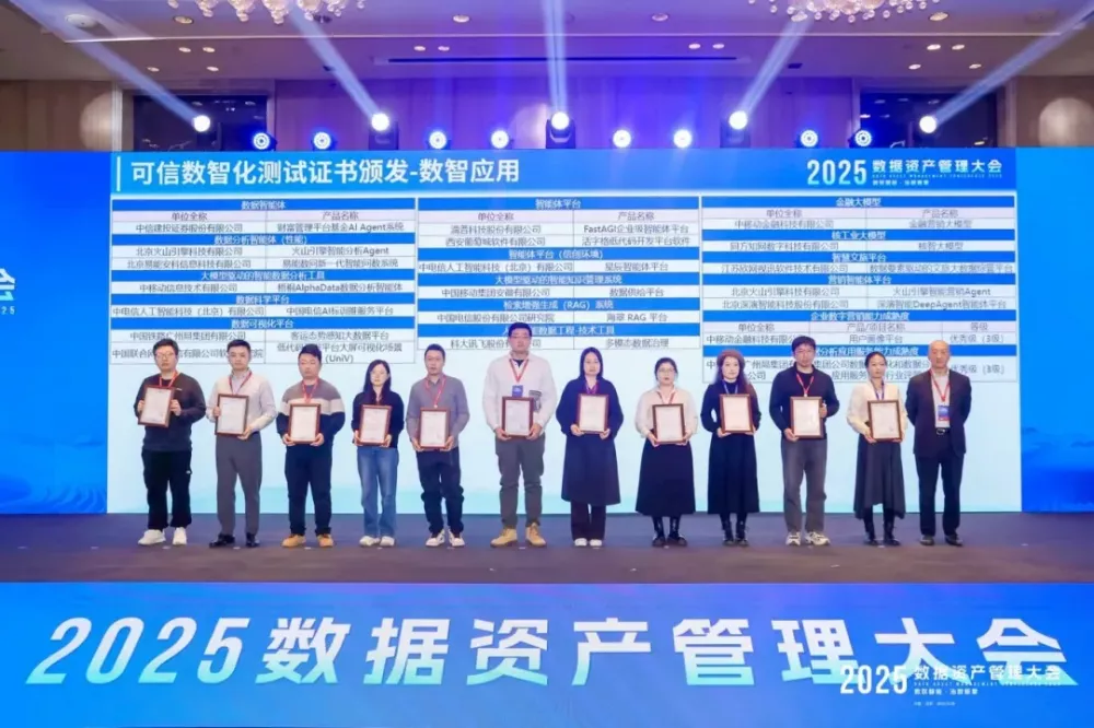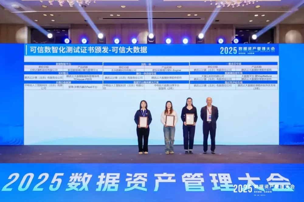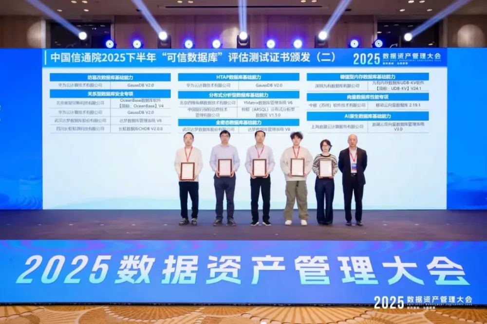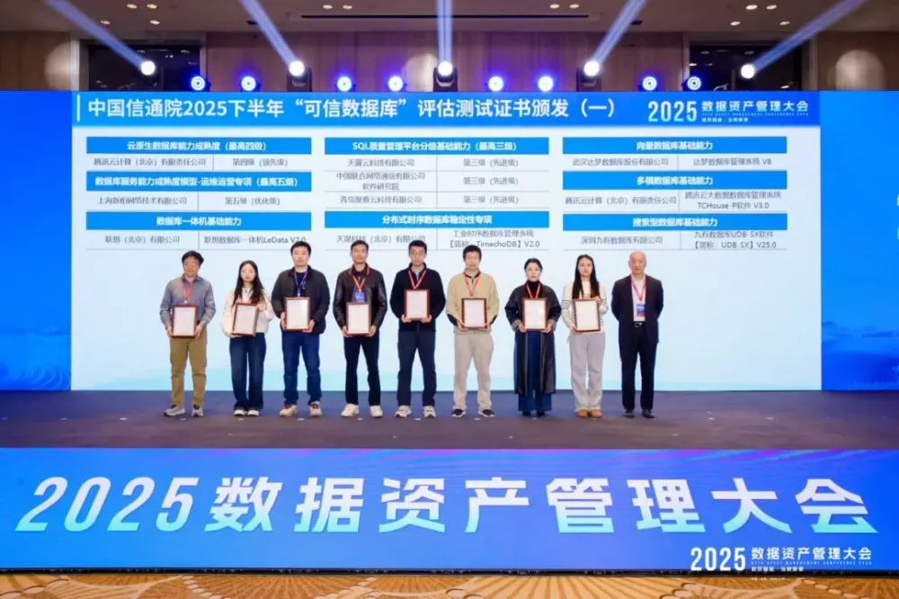 由中国通信标准化协会副秘书长南新生为2025年下半年通过中国通信标准化协会数据库标准符合性验证及“可信数智化”评估测试的企业颁发了证书。中国信通院自2015年起开展数据领域研究,逐步建成了数据平台、数据治理、数据流通、数据应用、数据安全、政务数据的数据标准体系,成为业界最具影响力的评估评测体系。2025年下半年,超过50家企业的90余款产品参与测试并获得证书。