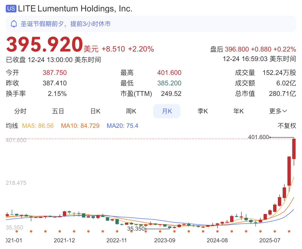 2025年以来,Lumentum股价屡创历史新高。截止发稿,该公司股价为395.92美元/股,相比年初暴增372%,总市值突破280亿美元。