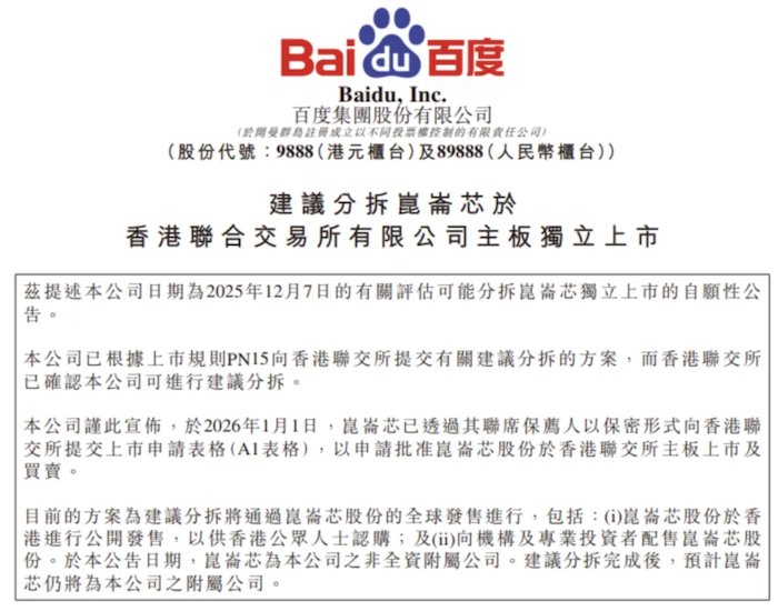 此外,天数智芯计划在1月8日登陆港交所;百度旗下GPU厂商昆仑芯在2025年大放异彩,百度今日发布公告,正式宣布分拆昆仑芯在港交所上市;另一家GPU厂商瀚博半导体完成了IPO辅导。