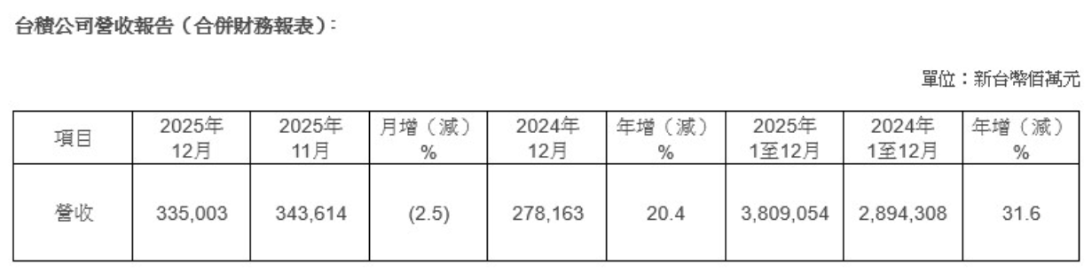2025 年 1 至 12 月累计营收约为 38090.54 亿元新台币(现汇率约合 8456.1 亿元人民币),较去年同期增加了 31.6%。