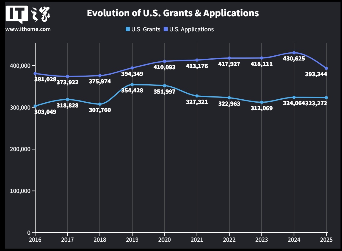 专利数据分析公司 IFI CLAIMS 发布最新年度报告显示,2025 年美国专利活动延续了多年下滑趋势。