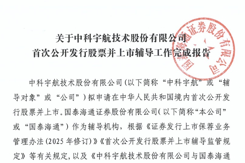 C114讯 1月18日消息(云青)证监会近日公开发行辅导公示系统显示,中科宇航技术股份有限公司(简称中科宇航)更新上市辅导状态。中科宇航于2025年8月12日在广东证监局进行了IPO辅导备案,辅导机构为国泰海通证券,近日更新为“辅导验收”。