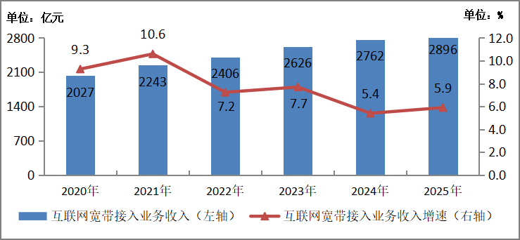 2025年,完成固定互联网宽带接入业务收入2896亿元,比上年增长5.9%,在电信业务收入中占比由上年的15.9%提升至16.5%,拉动电信业务收入增长0.9个百分点。