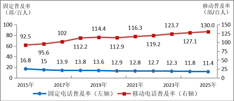 图2-1 2015—2025年固定电话及移动电话普及率发展情况