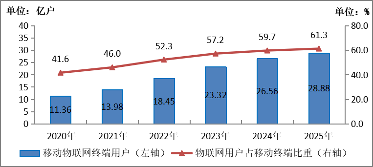 截至2025年底,中国电信、中国移动和中国联通三家基础电信企业发展移动物联网终端用户28.88亿户,全年净增2.32亿户,超过移动电话用户数10.61亿户,占移动网终端连接数的比重达61.3%。