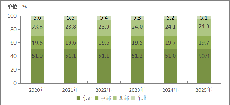 图5-1 2020—2025年东、中、西、东北部地区电信业务收入比重