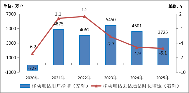 图3-4 2020—2025年移动电话用户和通话量增长情况