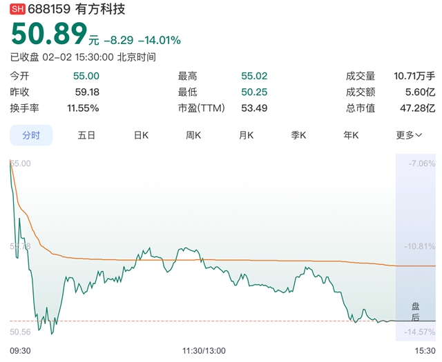 截止今日收盘,有方科技股价暴跌14%,最新市值为47.28亿元。