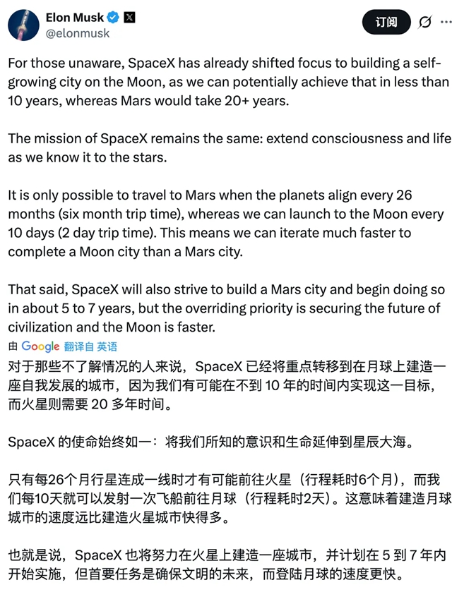 “可能有人还不知道,SpaceX已将重心转向在月球上建设一座自我成长的城市。因为我们有可能在十年内实现这个目标,而建立火星城市则需要二十年以上的时间。”马斯克周日在X上表示。