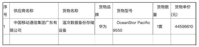 从公告可以看到,广东移动提供的核心“温冷数据备份存储设备”,采用了华为OceanStor Pacific 9550。