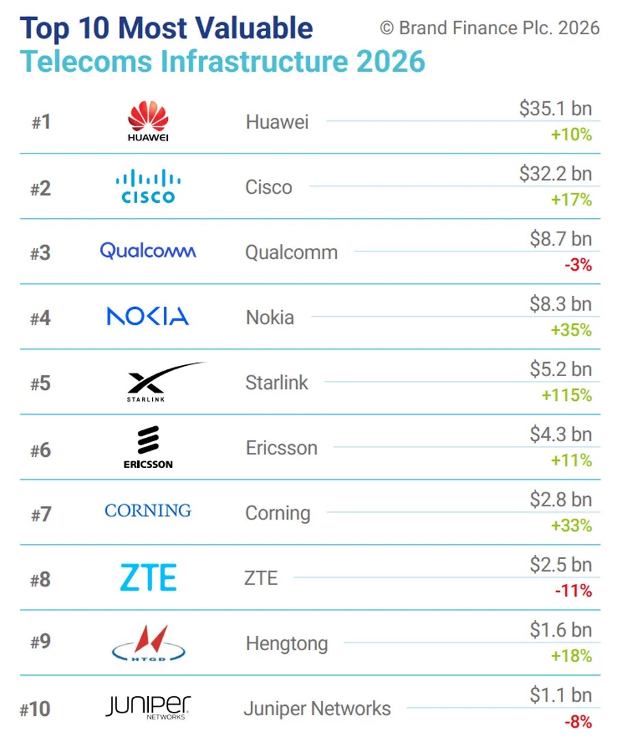 C114讯 3月11日消息(南山)近日,英国品牌评估机构“品牌金融”(Brand Finance)发布了2026年“全球通信基础设施品牌价值10强”排行榜(Telecoms Infrastructure Brands 2026)。