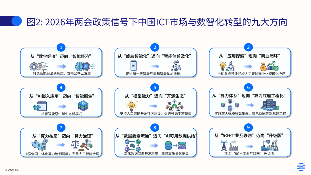 在政策与市场双重驱动下,IDC识别出未来几年中国ICT与数智化转型的九大关键方向。
