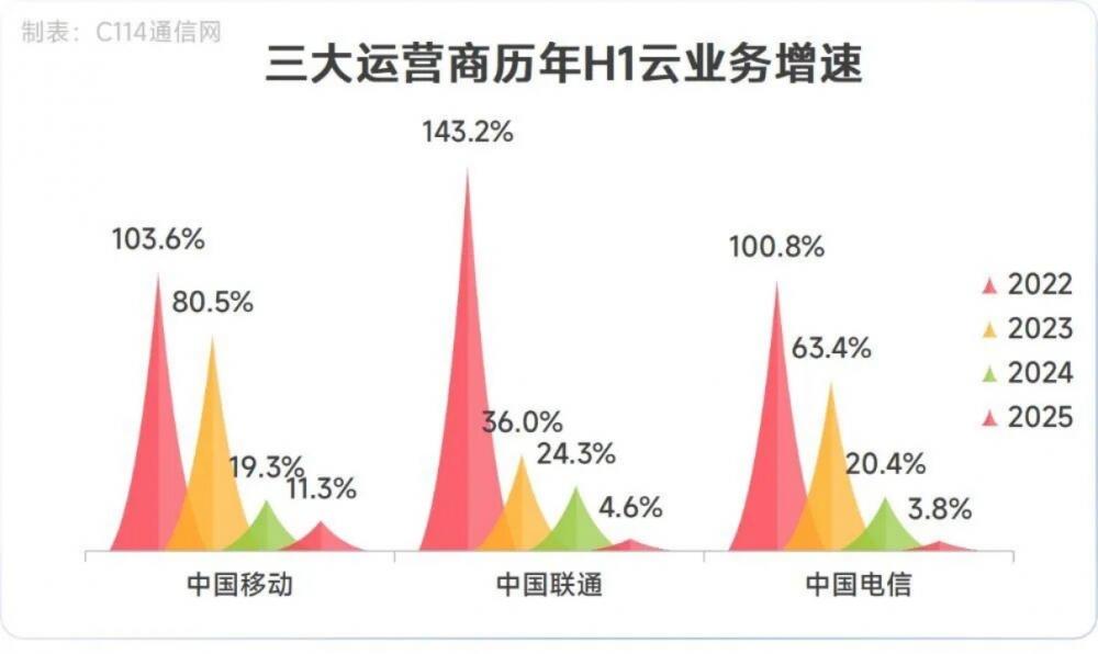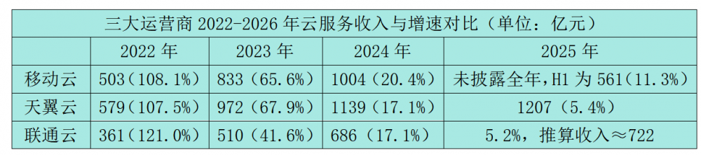 移动云未披露2025年全年云收入,但据此前公布的2025年上半年云收入561亿元,同比增长11.3%,对照2024年全年1004亿元的云收入规模,不难推算其全年增速已大幅回落。
