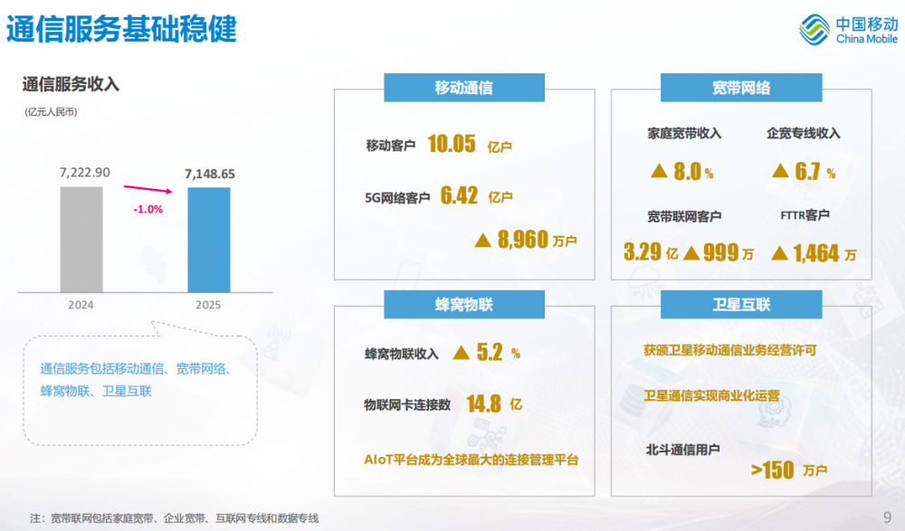 中国移动则以“移动爱家”品牌为引领,千兆宽带客户突破1.1亿户,FTTR客户净增1464万户,通过“宽带+应用+权益”的融合模式,提升家庭客户综合ARPU(同比增长1.6%)。
