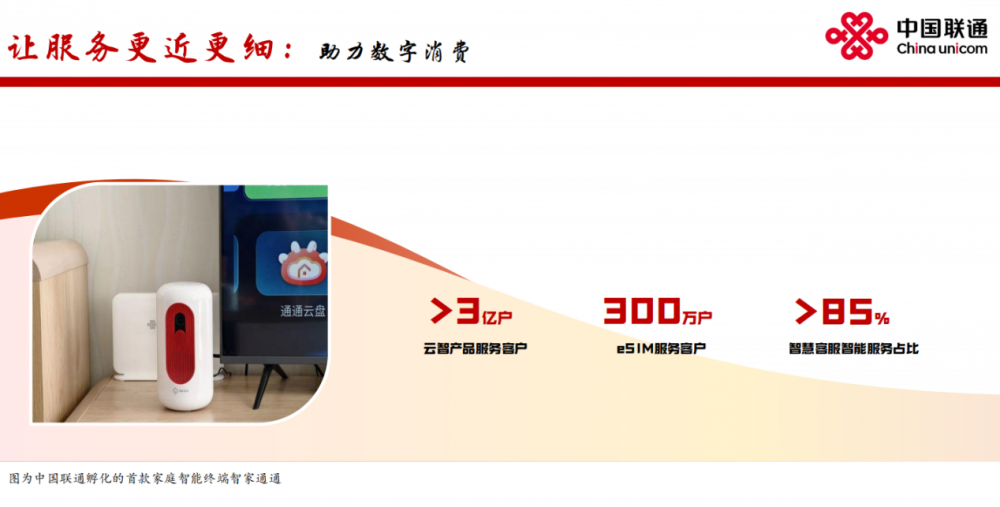 中国联通以产品创新切入家庭融合,打造收入增长第二曲线,深化“AI+产品创新”,加快智慧家庭产品云化和智能化迭代,聚焦智家核心入口和控制中枢,深度定制“智家通通”等多类终端产品。