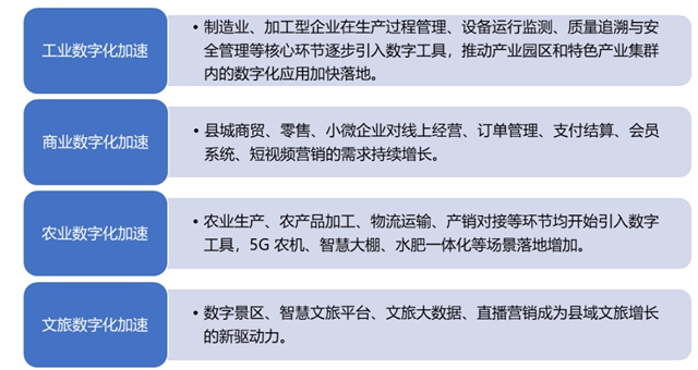 与此同时,电商、直播经济、冷链物流、品牌农业、智慧农业、智慧文旅等新模式在县域快速渗透,县域数字化需求也呈现出明显的扩张和升级趋势:从传统产业向工业、商业、农业、文旅等多领域延伸,从单点工具应用走向全链路集成,从提升内部效率扩展到重构产业生态,从被动适应市场转向主动数据驱动。这一进程对数字基础设施、综合解决方案和专业服务能力提出了更高、更迫切的需求。