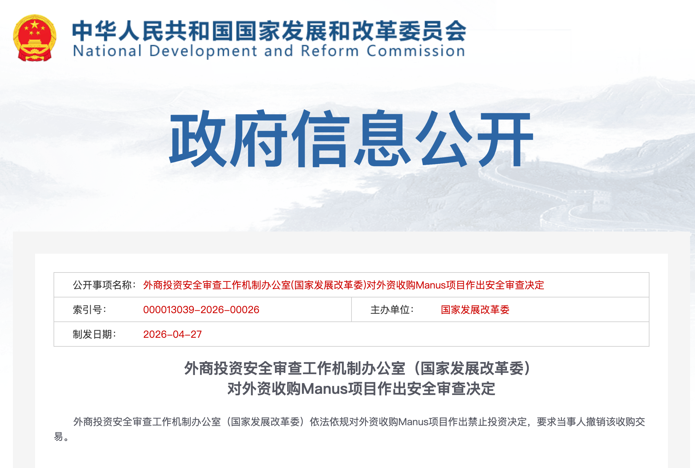 外商投资安全审查工作机制办公室(国家发展改革委)依法依规对外资收购Manus项目作出禁止投资决定,要求当事人撤销该收购交易。